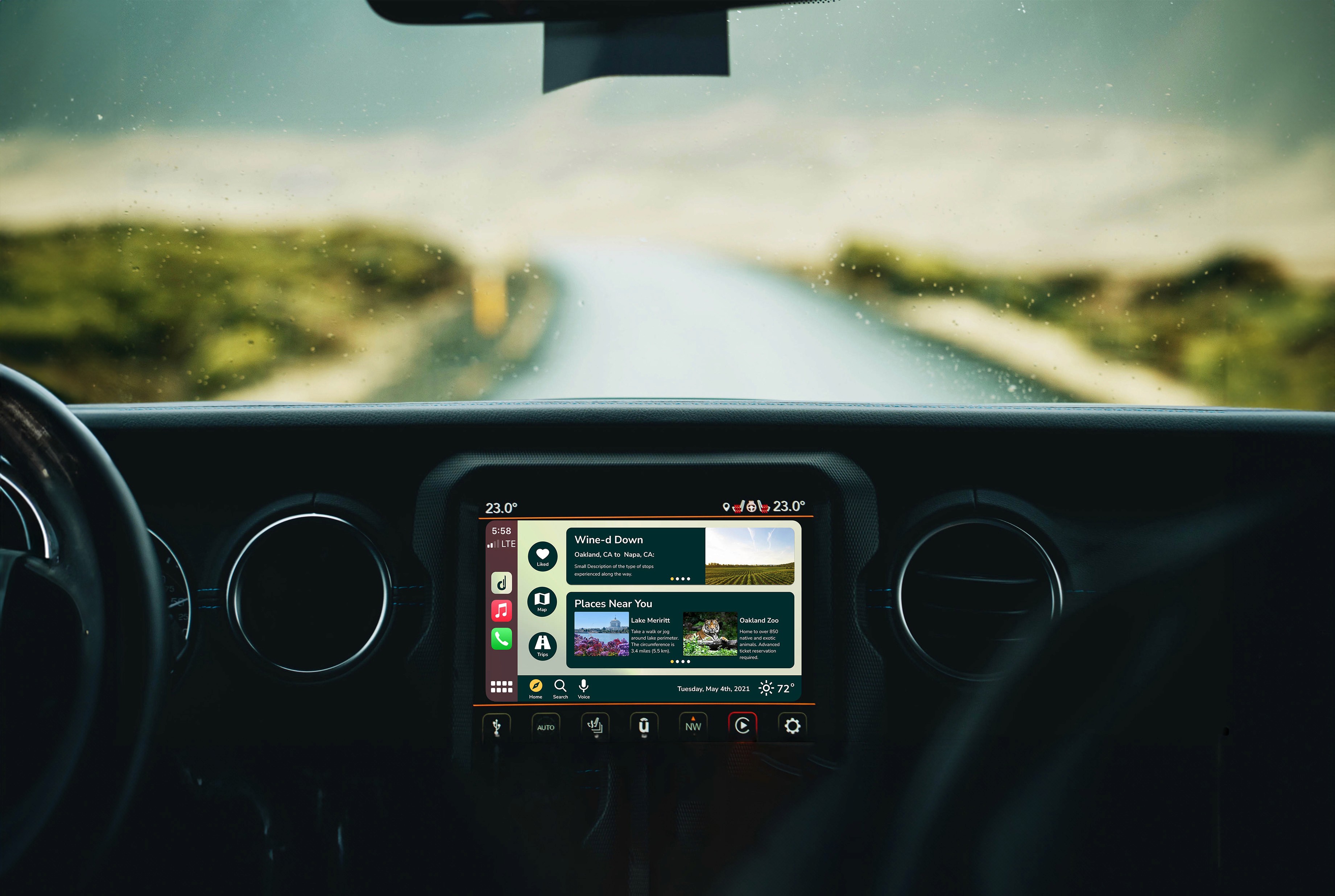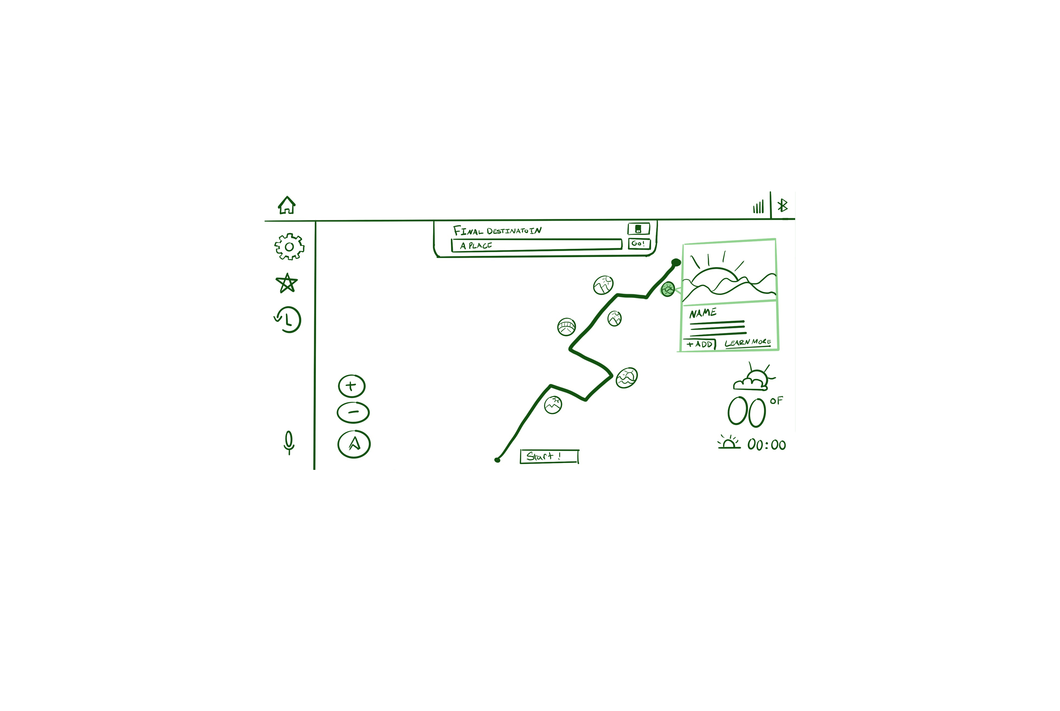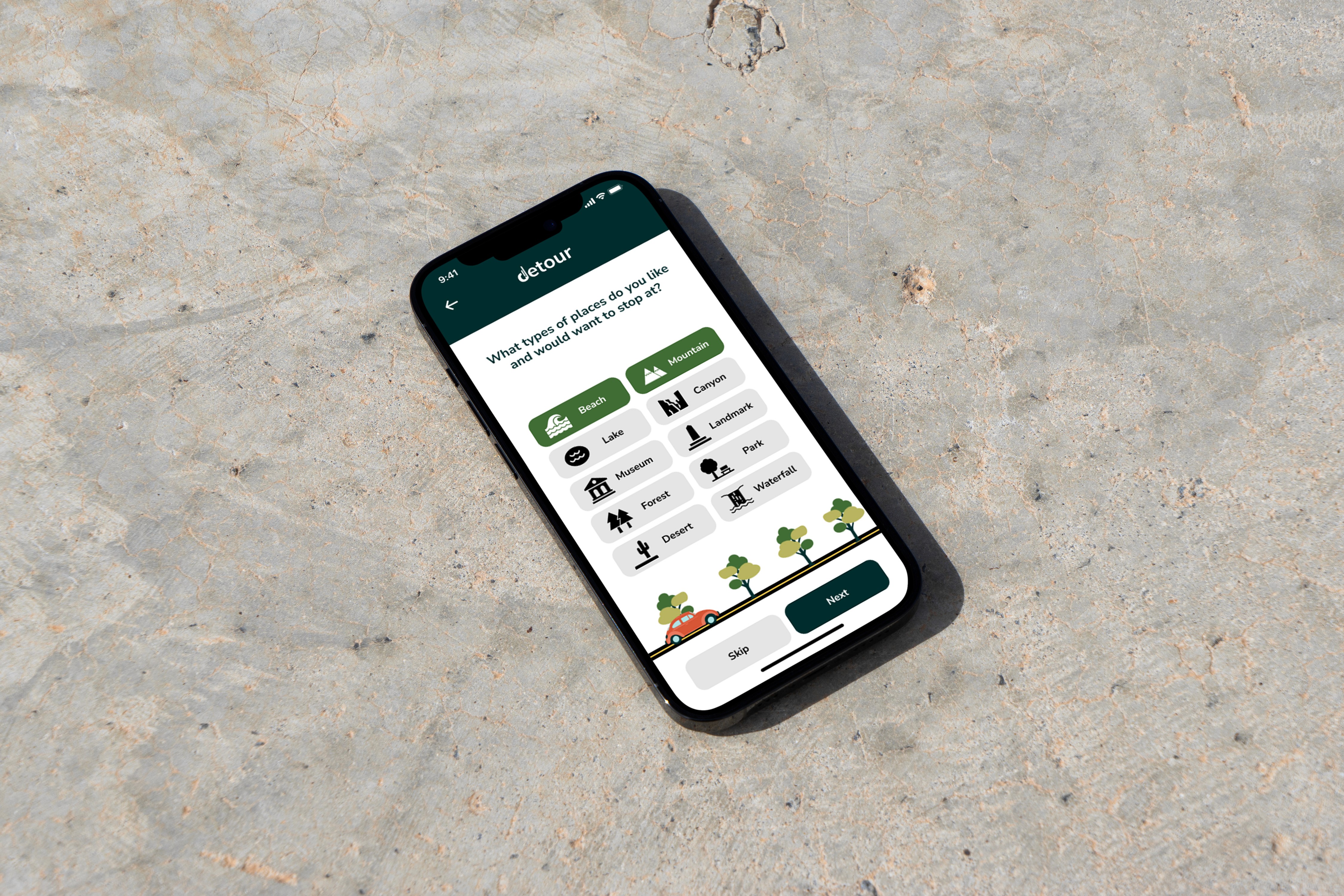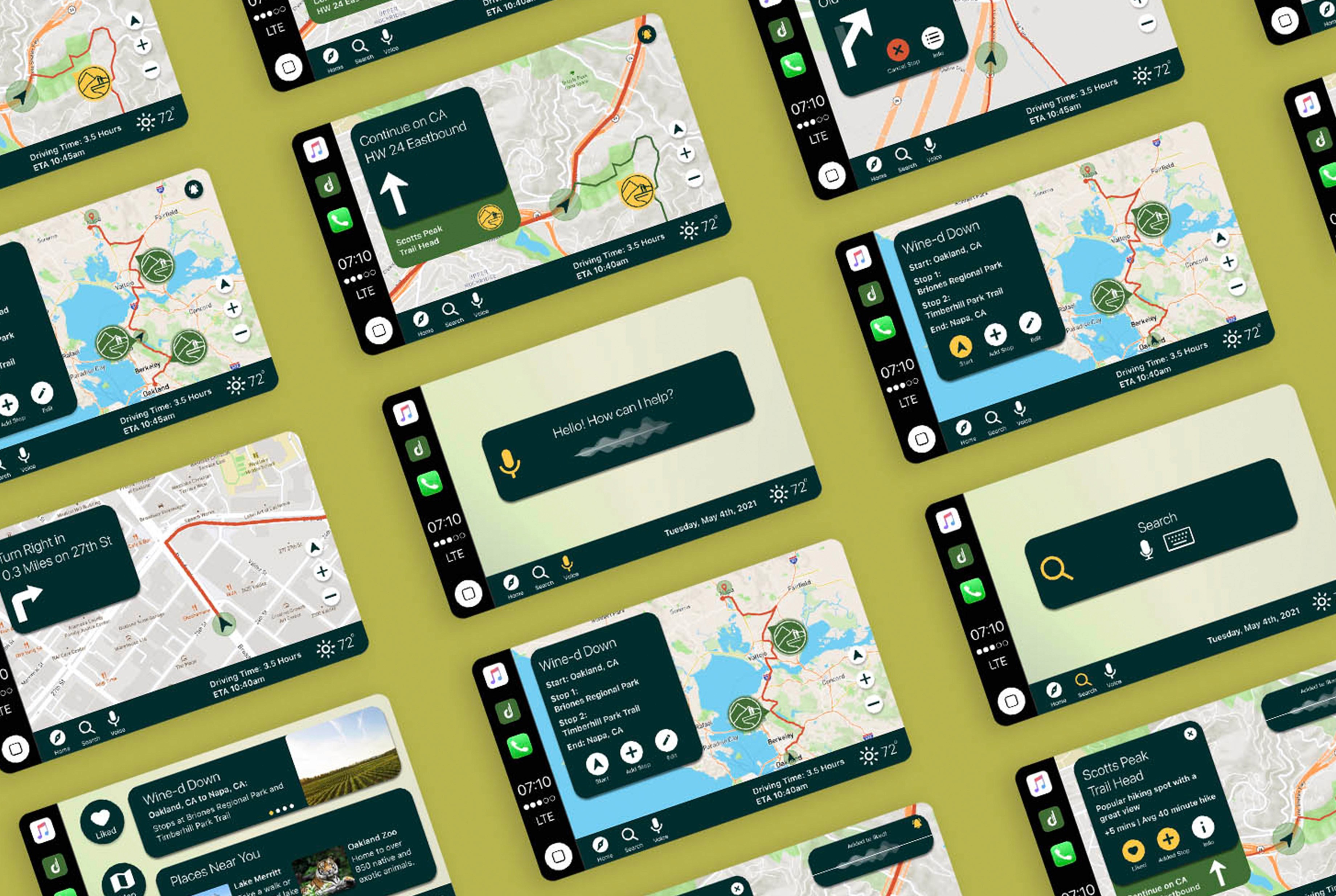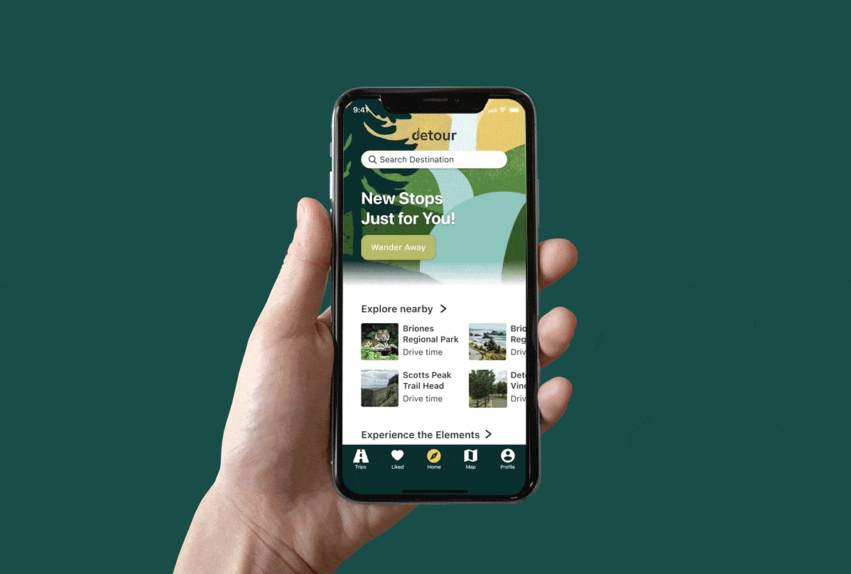 Detour is a UX project I completed as part of the UC Berkeley UX UI Certificate Program, designed in a team of five. The brief was to simplify the process of discovering new places by helping users curate the most scenic route to their destination combining the utility of navigation with the joy of exploration. I contributed to the full process: creating proto-personas, conducting competitor analysis, leading initial user interviews, and developing user flows for both the mobile app and CarPlay. I also designed and prototyped across Lo-Fi, Mid, and Hi-Fi fidelity, and created the illustration system that gives the app its warm, travel-inspired visual identity. The result is a dual-platform experience, a mobile app where users build and save scenic trips, and a CarPlay integration that activates the route hands-free once they're on the road.