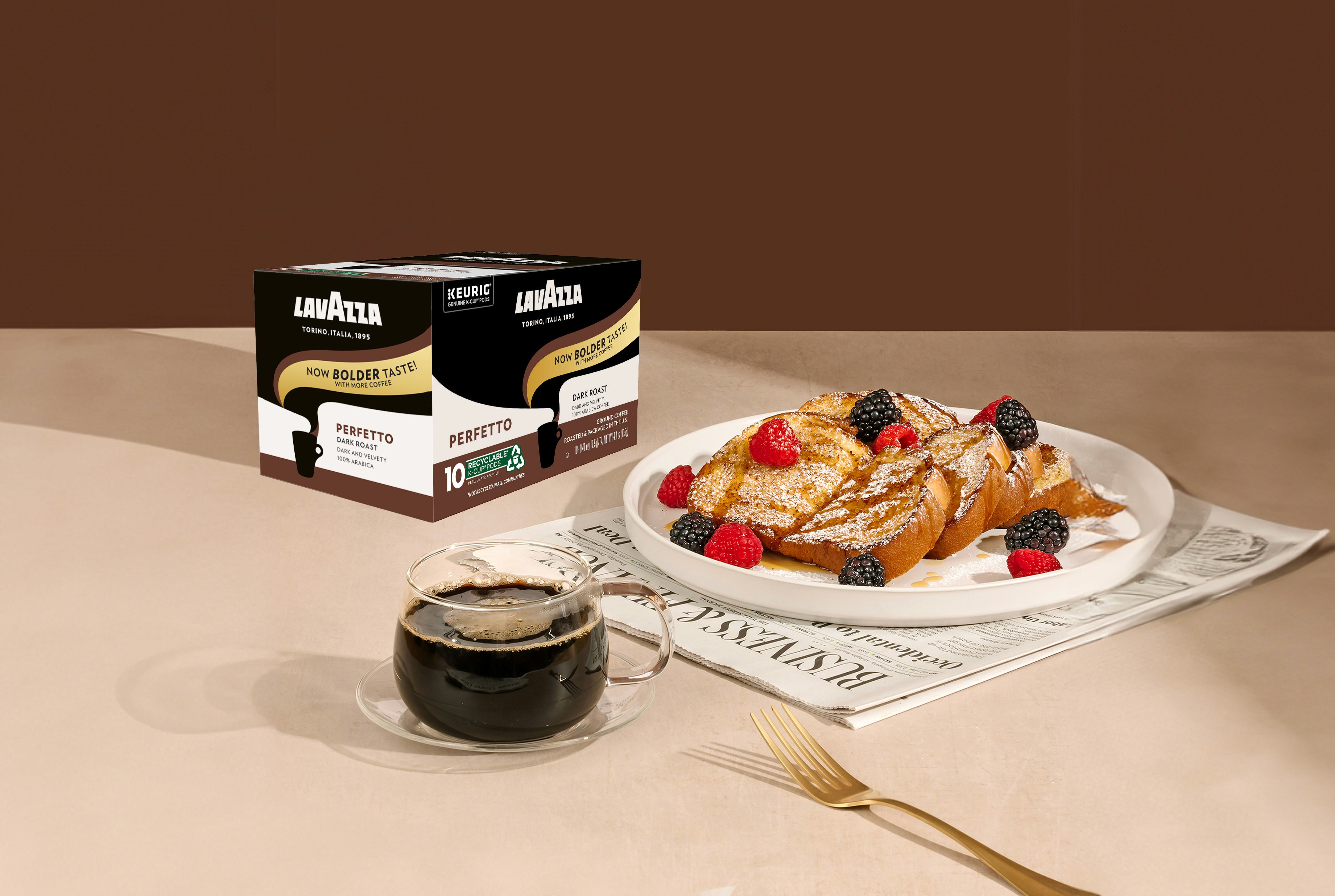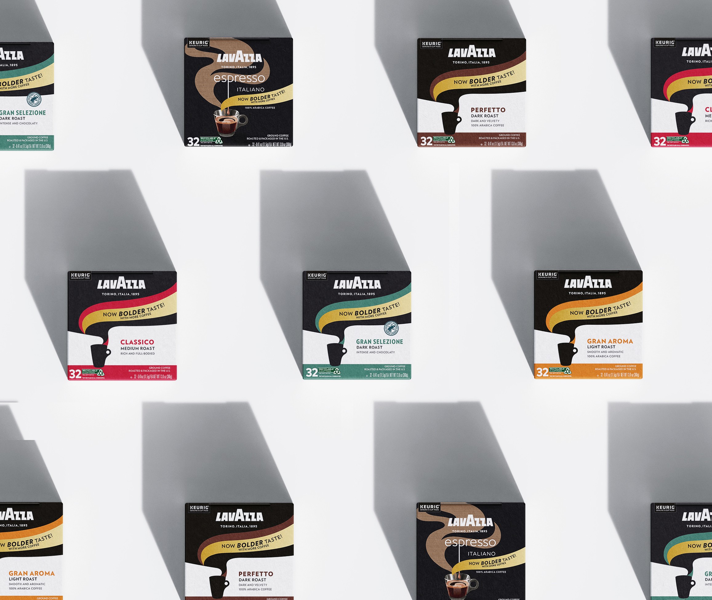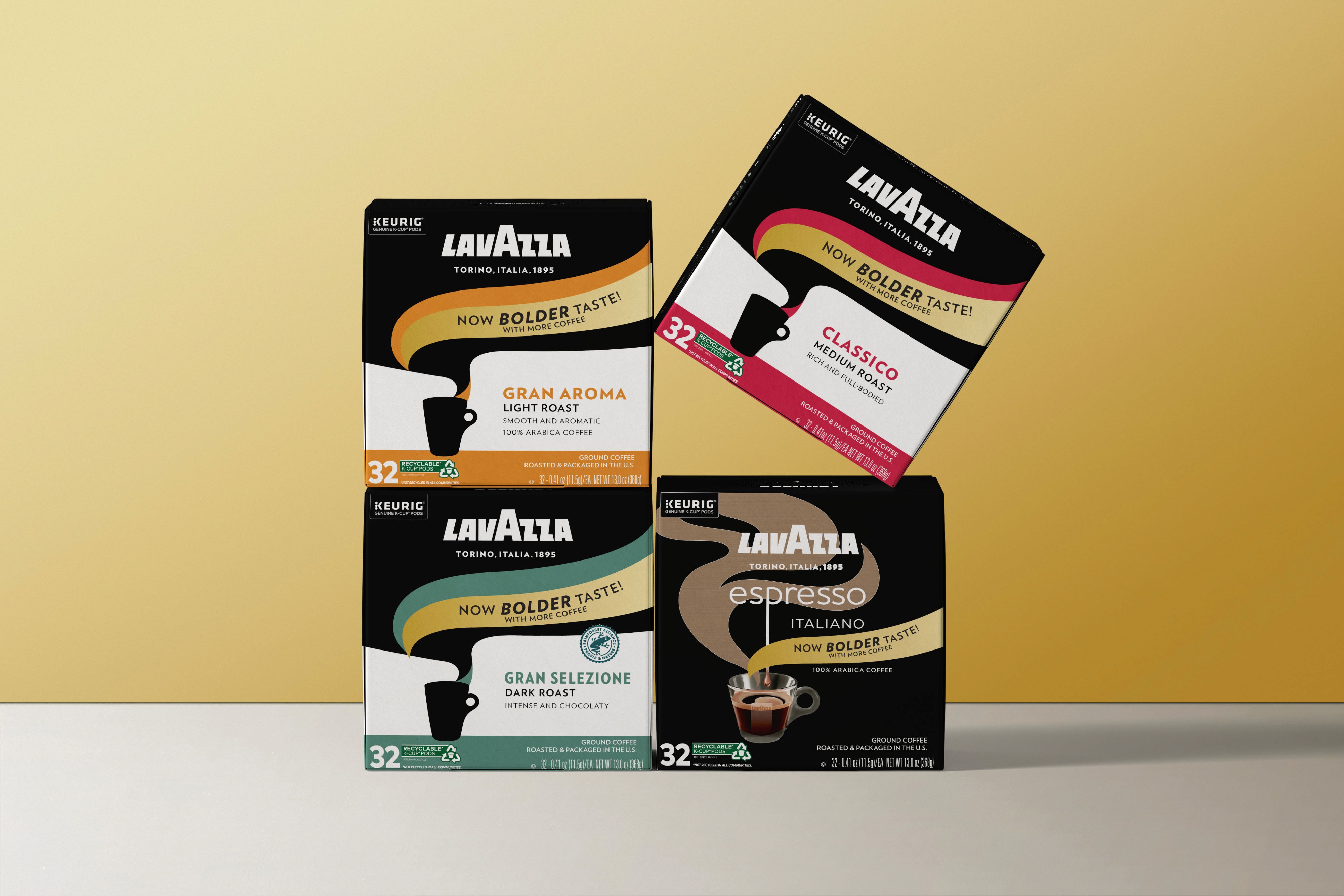 When Lavazza responded to consumer feedback by adding more grounds to each Keurig capsule for a stronger brew, I was briefed to communicate the change boldly and immediately at shelf — deliberately disruptive, designed to stop a coffee buyer mid-aisle and signal something new. Working directly with the VP of Marketing Americas on a gold color direction, I adapted Lavazza's existing packaging system across the full product line with a 'Now Bolder Taste' callout that reads instantly in a competitive retail environment. The result is now in stores across the US — a project that required me to work within an established brand system, navigate senior stakeholder direction, and deliver production-ready packaging for a globally recognized brand.