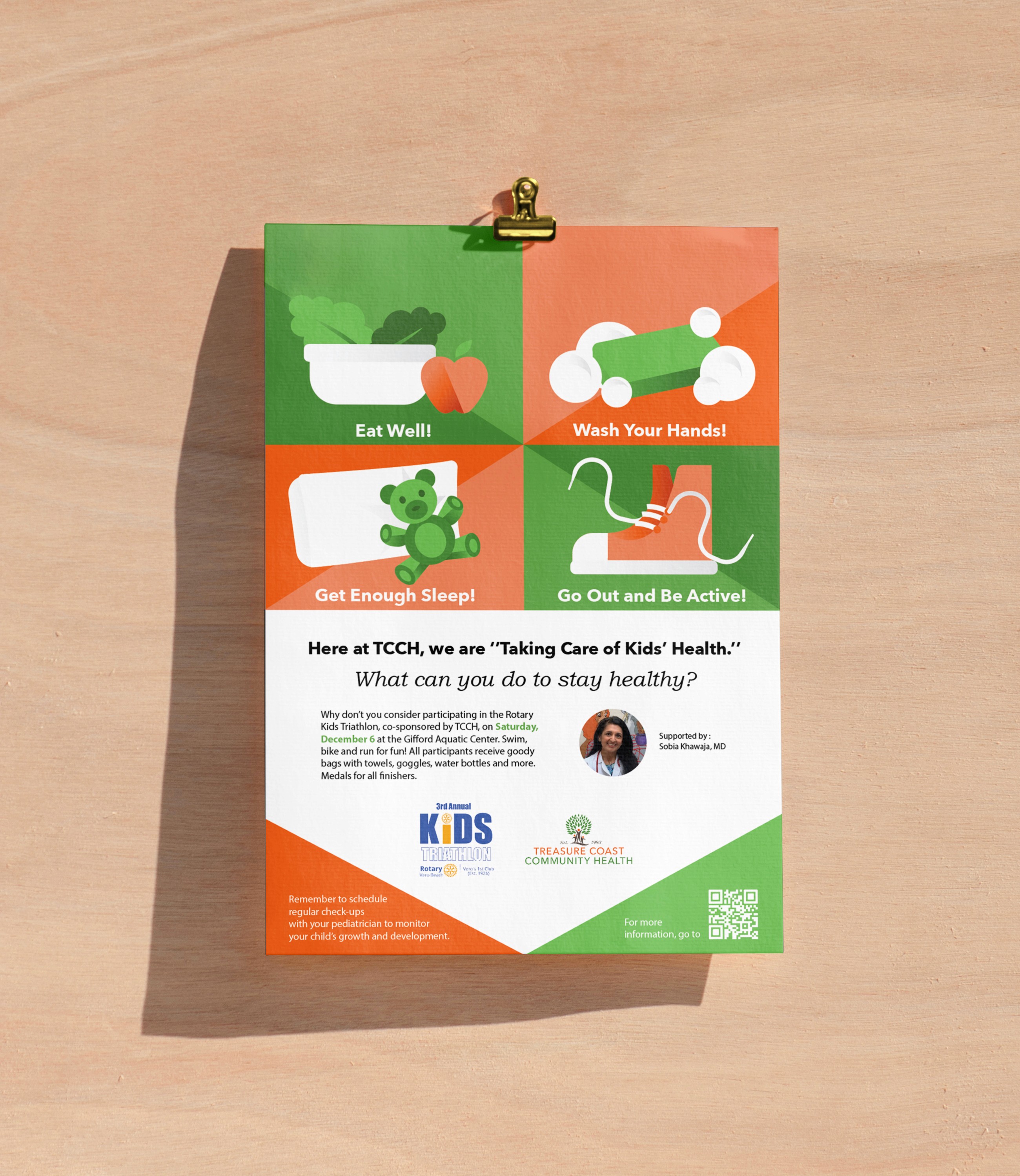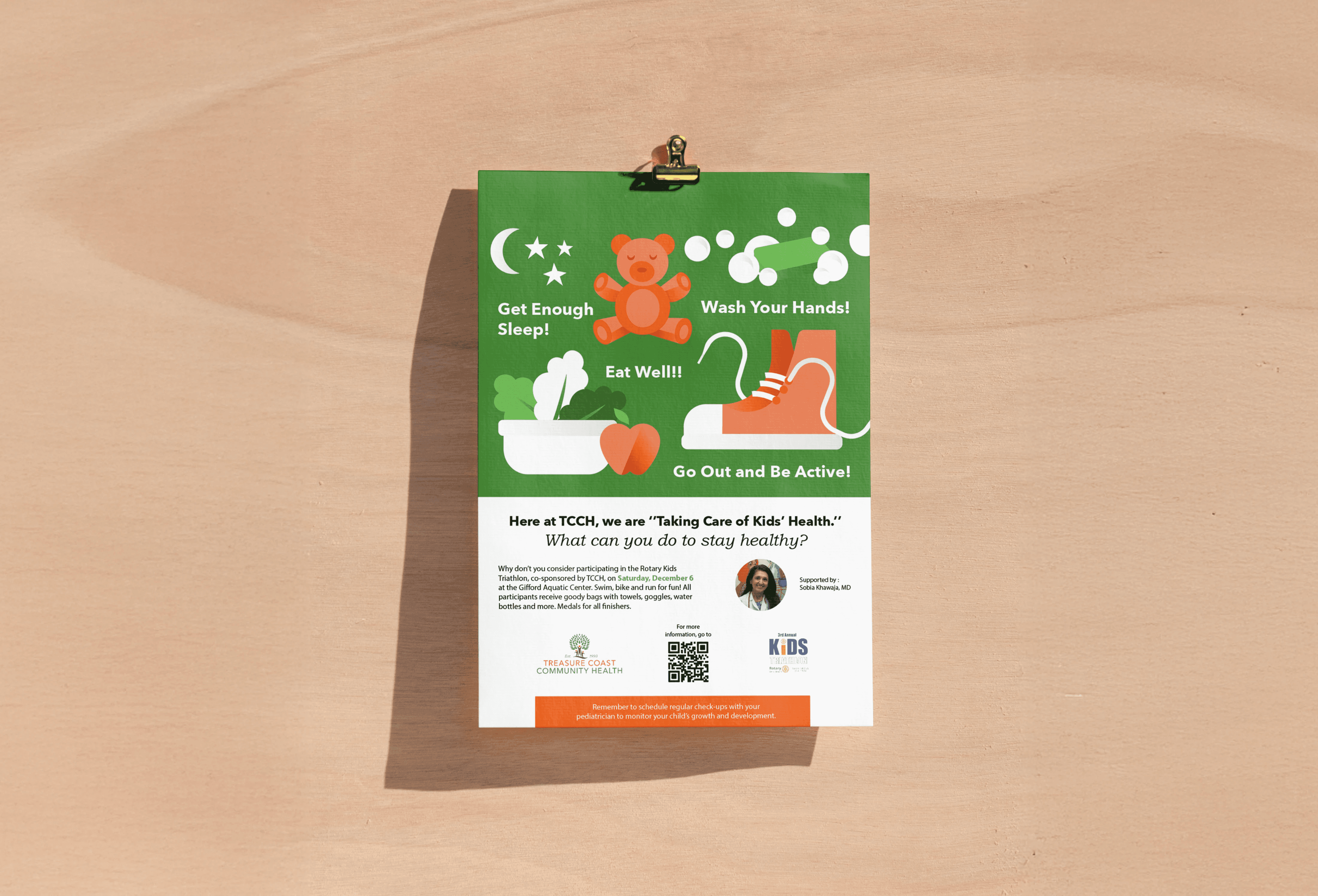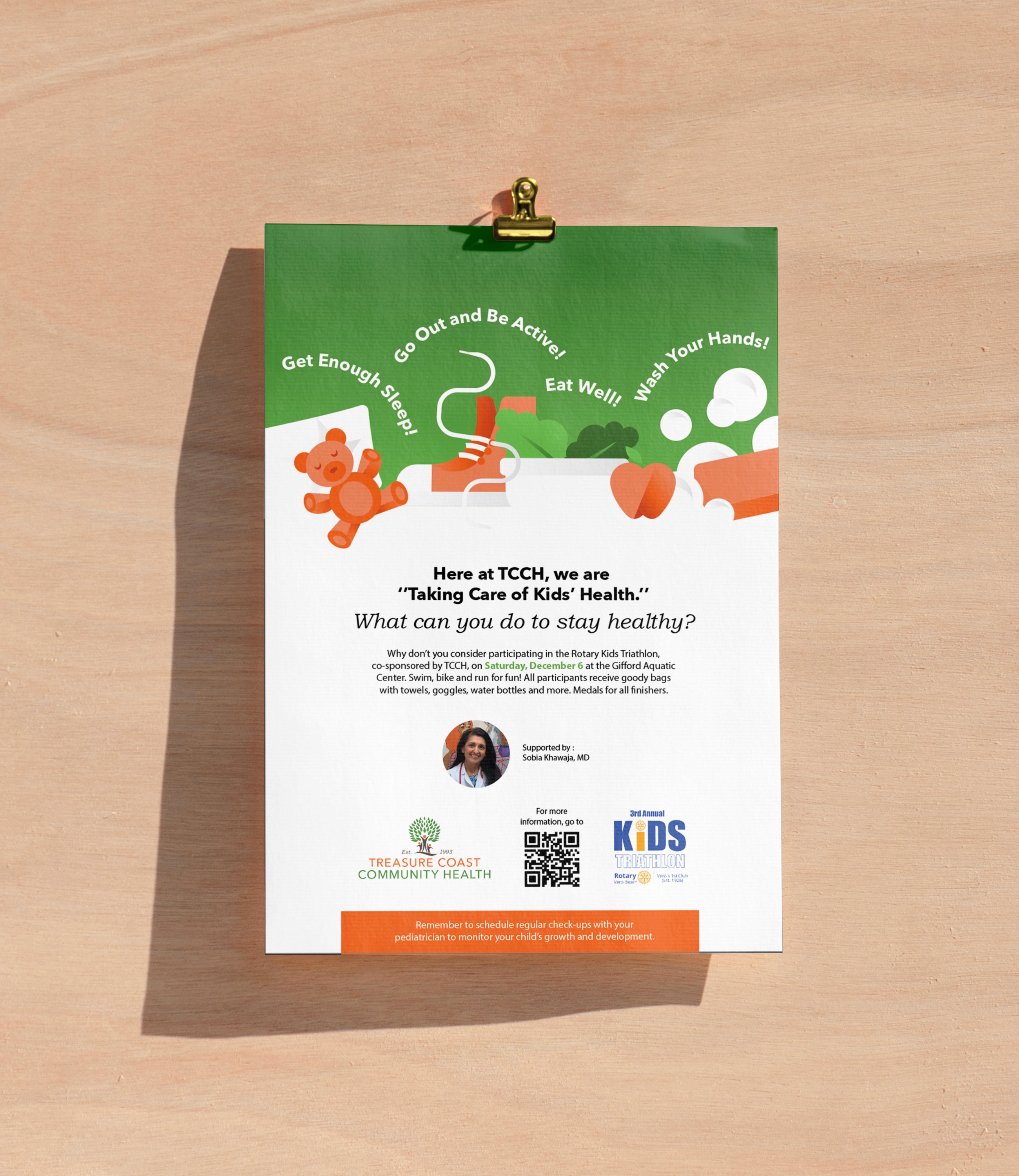 This was a pro bono project I took on because the mission mattered. Treasure Coast Community Health Clinic operates on a sliding scale, providing accessible healthcare to children regardless of their socioeconomic background. In partnership with Rotary Kids Triathlon, they needed a poster that could communicate healthy habits to kids in a way that felt fun, approachable, and age-appropriate. I created a set of playful flat illustrations paired with simple healthy tips, designed in the clinic's brand colors of orange and green. The illustrations work both as individual assets and as a cohesive poster composition, giving the clinic a versatile set of visual tools they can reuse across future health education materials.